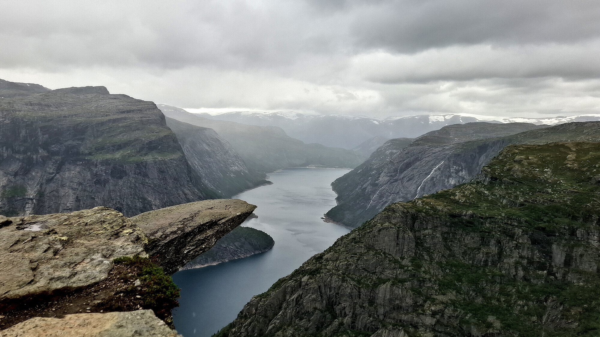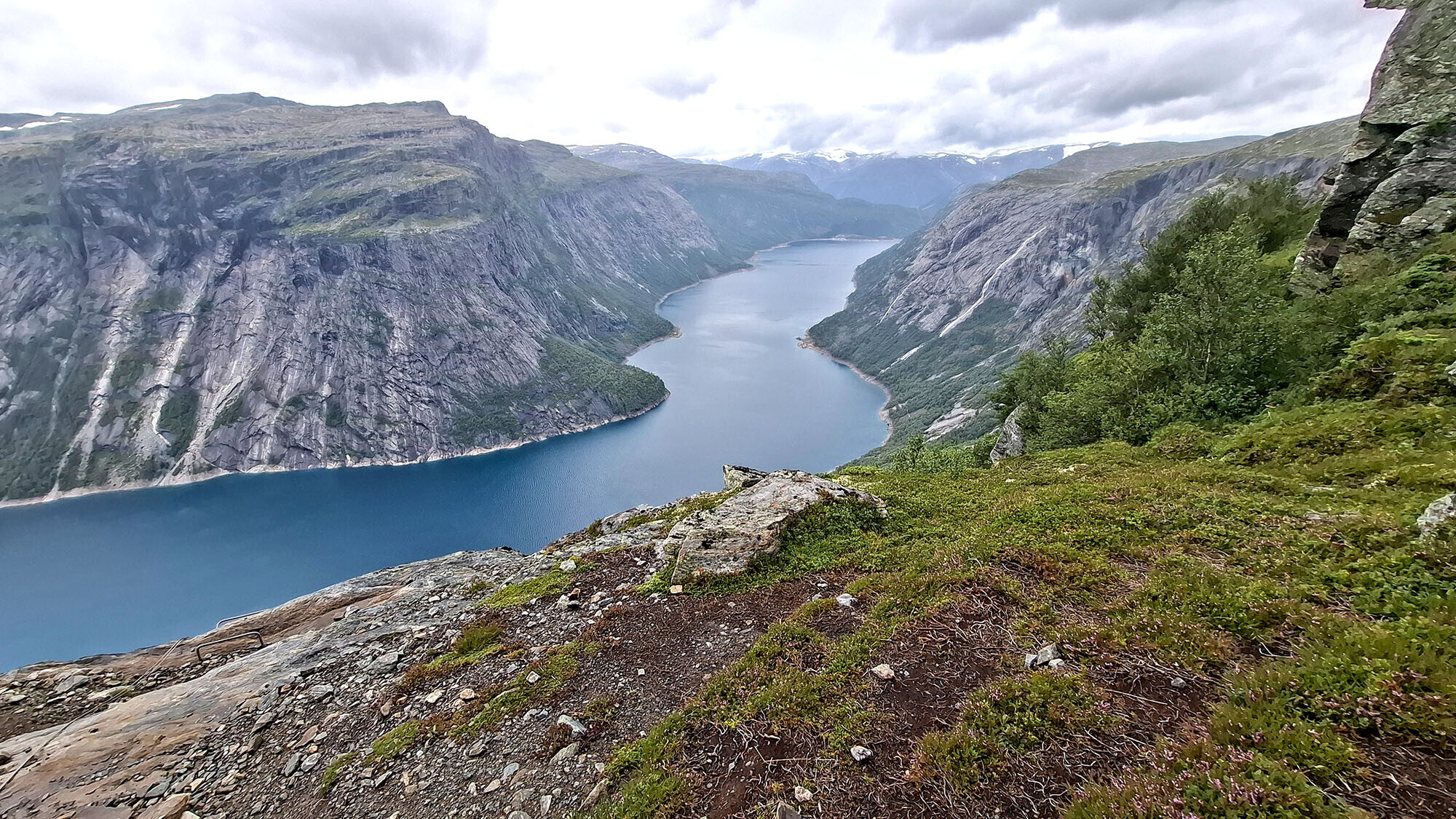 Underveis passerte de mange mennesker på vei tilbake, og da de nådde klippekanten, var køen redusert dramatisk, og det var kanskje bare fem minutter igjen å vente. Til tross for at de hadde sett bilder av Trolltunga flere ganger tidligere, var det lite imponerende sammenlignet med hvor fantastisk det var å se det i virkeligheten. Fjellet stikker ut av fjellet på rundt 1100 meters høyde, med et fall på 700 meter ned over Ringedalsvatnet. Det er ikke rart at naturopplevelsen tiltrekker seg mellom 80 000 og 100 000 besøkende hvert år, hvorav de aller fleste kommer i høysesongen om sommeren.