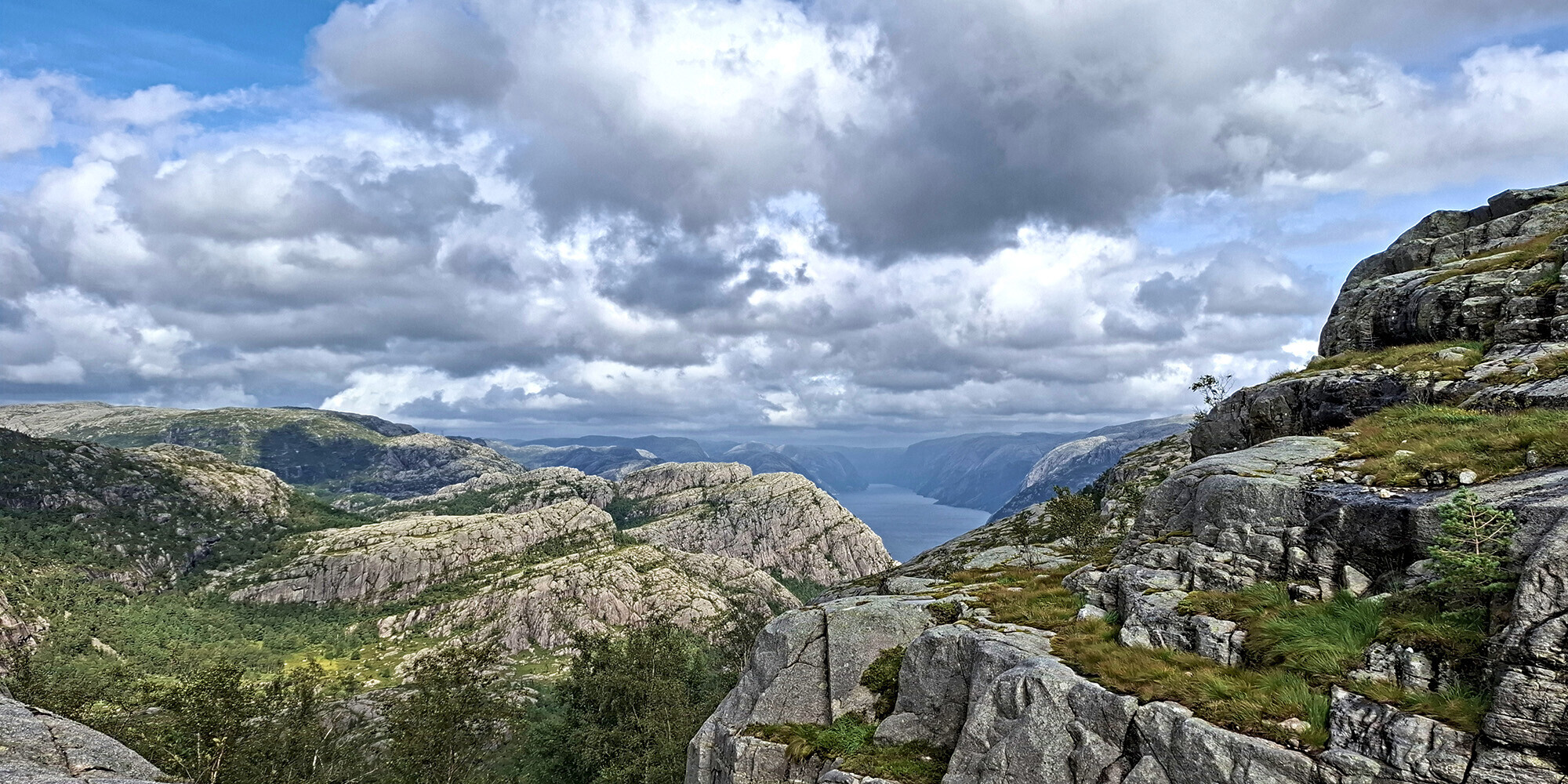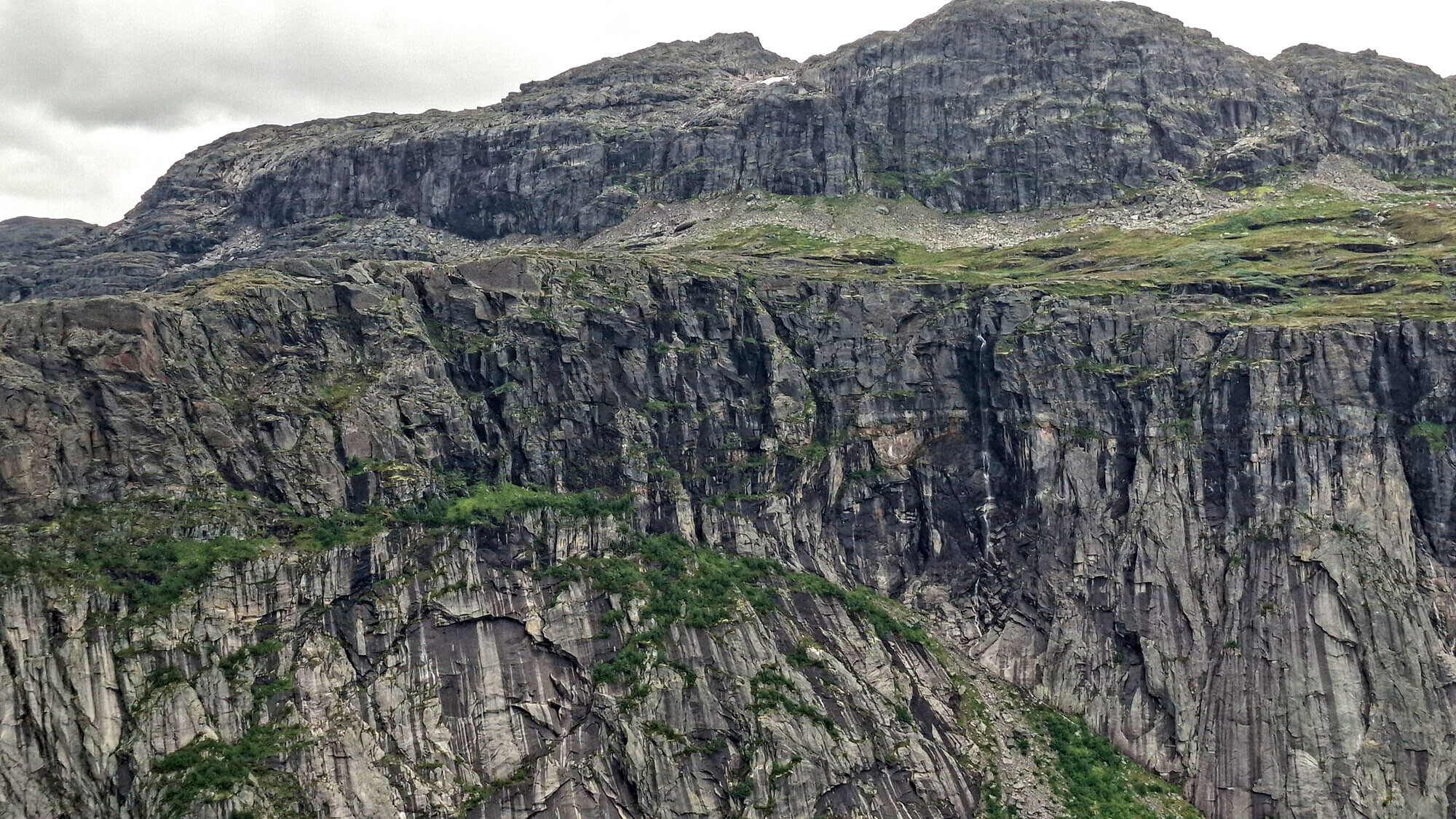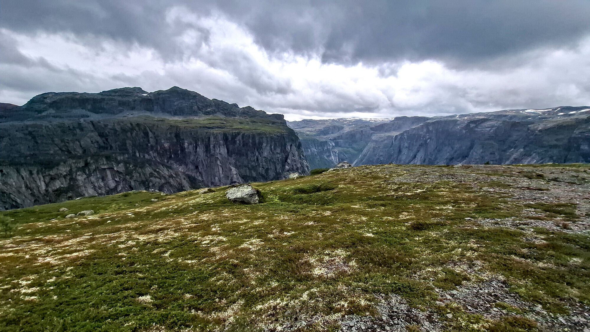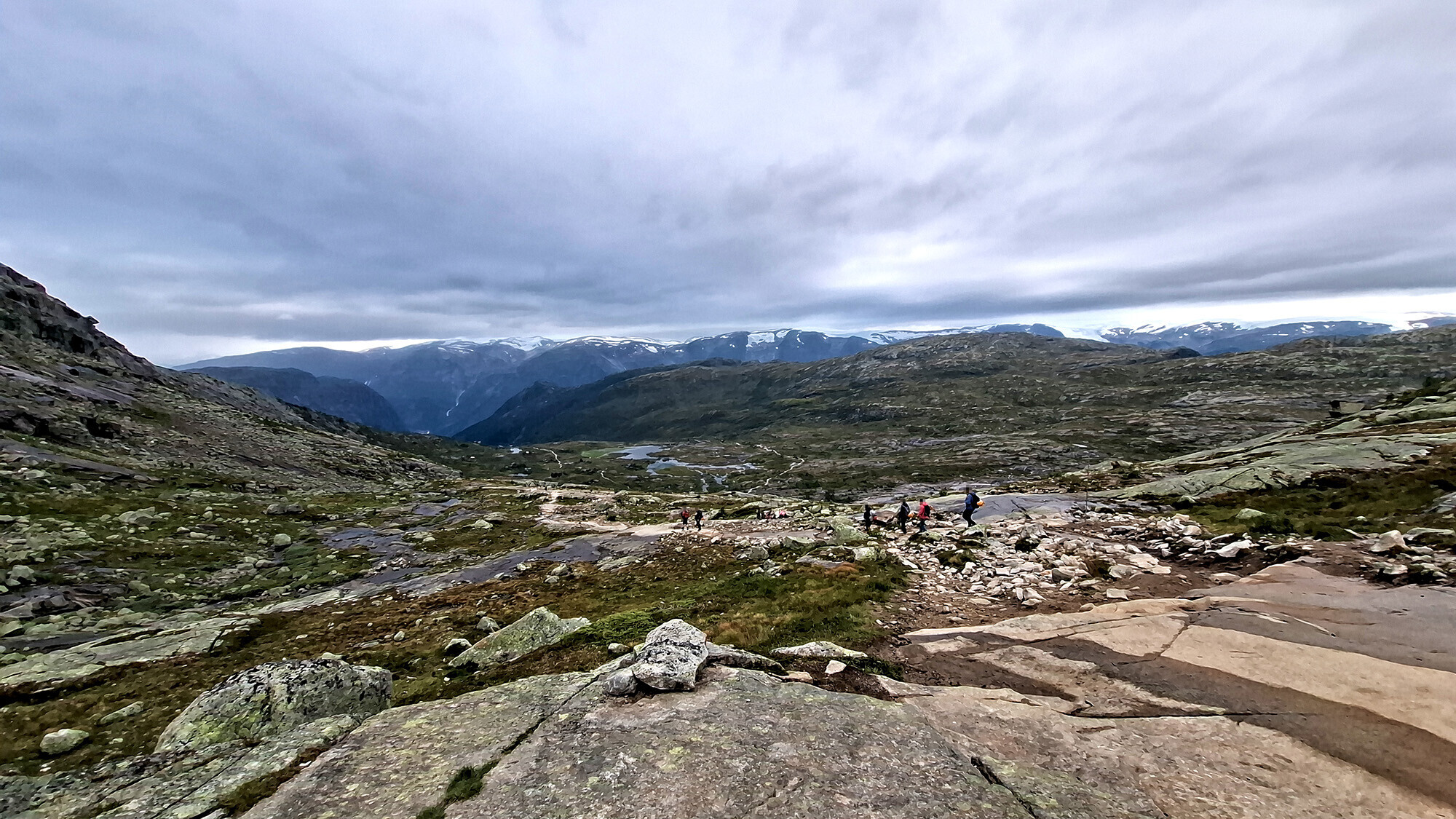 Noen etapper og 250 meter senere befant de seg endelig på toppen av fjellveggen. På den andre siden av dalen kunne de se Trolltunga, og noe som så ut som en lang kø av folk som ventet i nærheten. Guiden viste deretter vei til det endelige målet, som var en 2,5 km lang vandring over fjellet med varierende vegetasjon og fremkommelighet.
