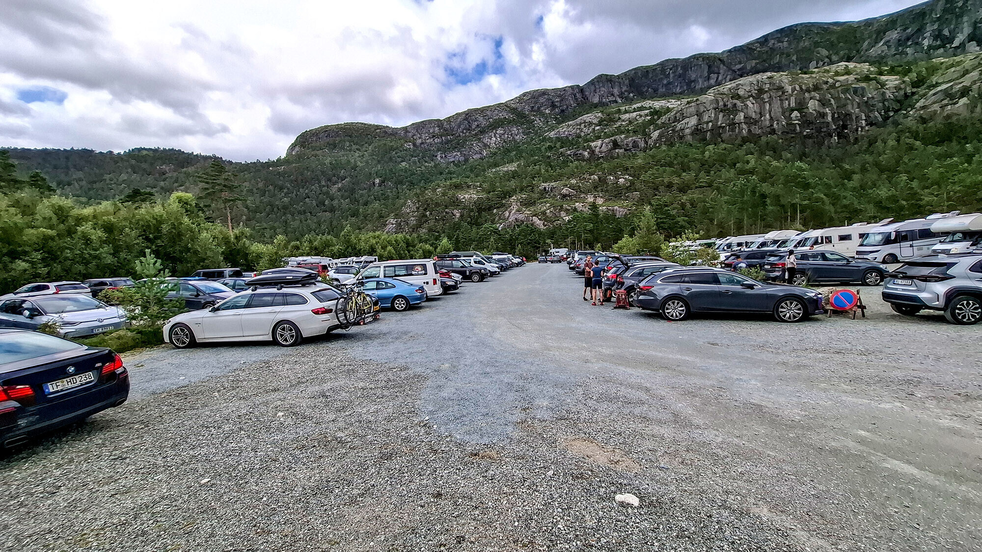 På parkeringsplassen ved Preikestolen skjønte de raskt hvor enormt populært dette stedet var. Bilene sto tett i tett, og nummerskiltene var fra alle tenkelige land i Europa. Sammenlignet med Trolltunga hadde dette stedet mer enn tre ganger så mange besøkende i året, og selv her kom de fleste om sommeren. Før de tenkte på å gå, benyttet de imidlertid anledningen til å spise og gjøre klar sekken.