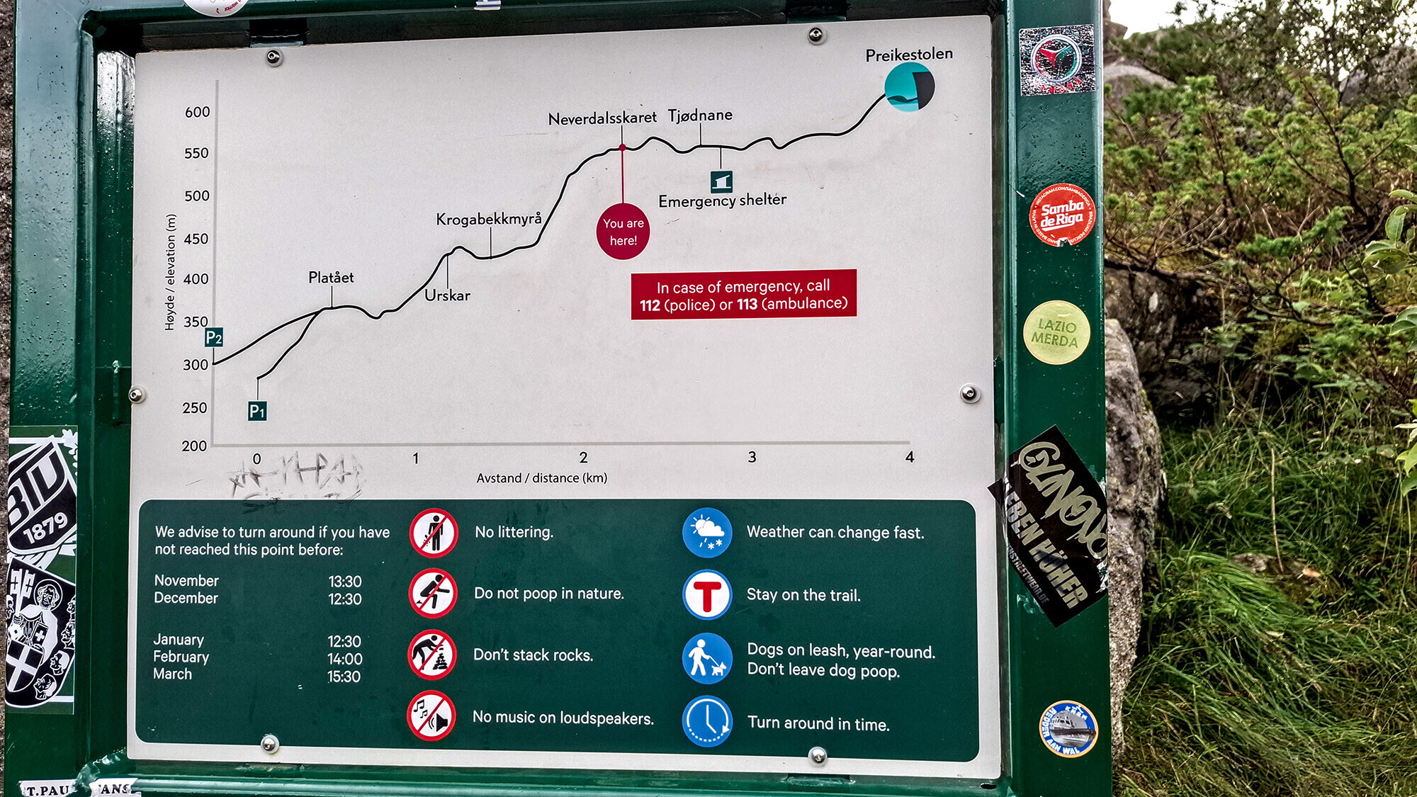 Selve turen var relativt kort, men nesten hele veien opp var omgjort til store trappetrinn for å gjøre det så enkelt som mulig å komme seg rundt. I 2013–2014 hadde den norske regjeringen hyret inn nepalere for å ødelegge naturopplevelsen som var der fra begynnelsen for å gjøre dette nærmest handikaptilgjengelig. En del av opplevelsen av å være i skogen ble dermed ødelagt, da dette føltes mer som å gå rundt på en flyplass eller i en flerkulturell storby, da de overalt hørte språk de ikke forstod, det var helt fullt av mennesker, og gåturen var ikke mye til spasertur. Som alltid er det pengene som rår, for Norge kan helt sikkert tjene mye mer på turisme ved å sørge for at så mange som mulig kan komme seg rundt fjellet, og dermed komme seg til landet.