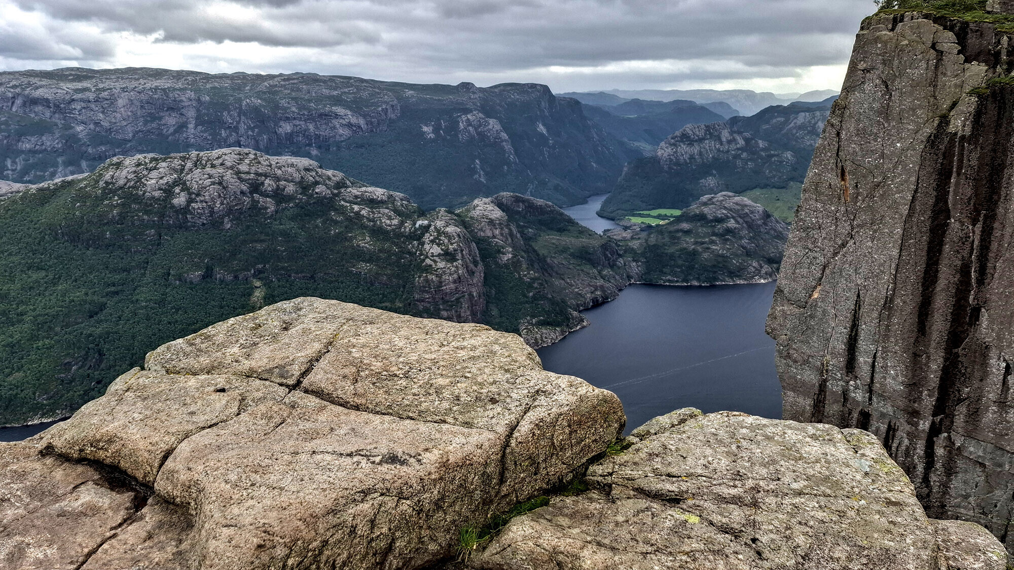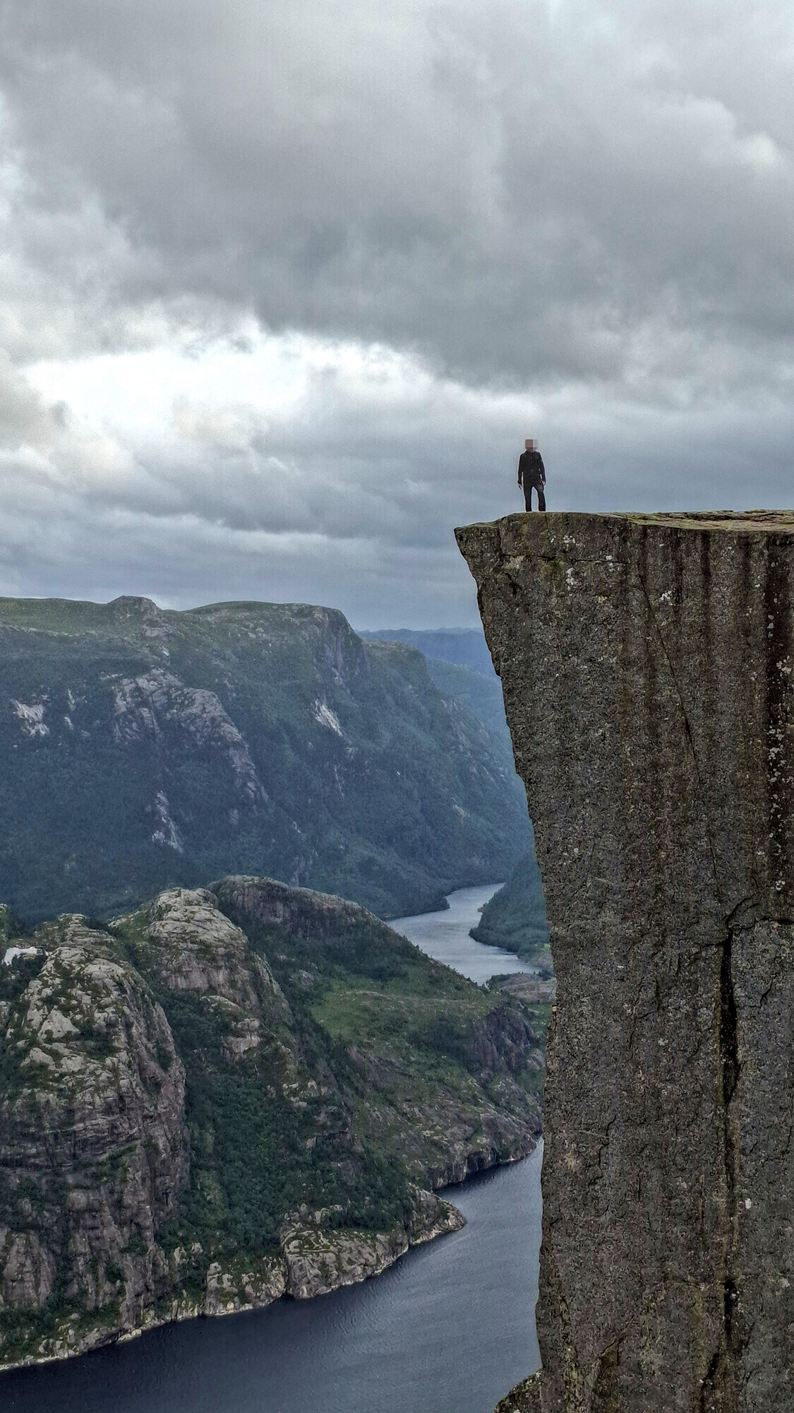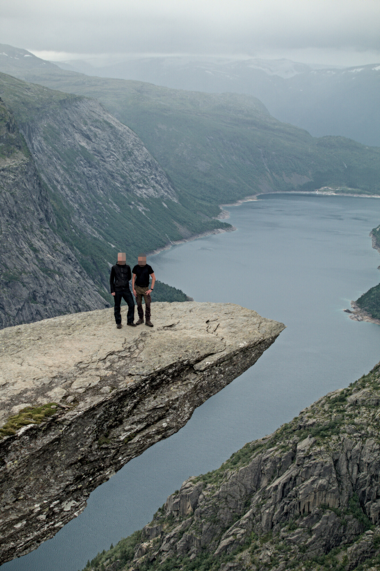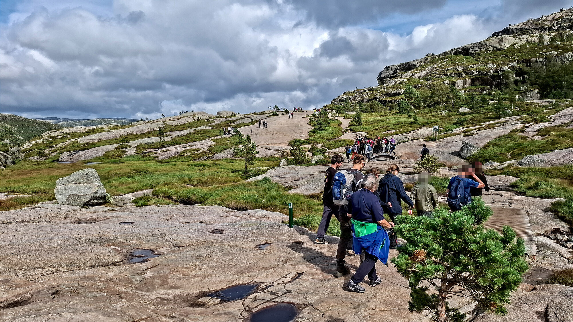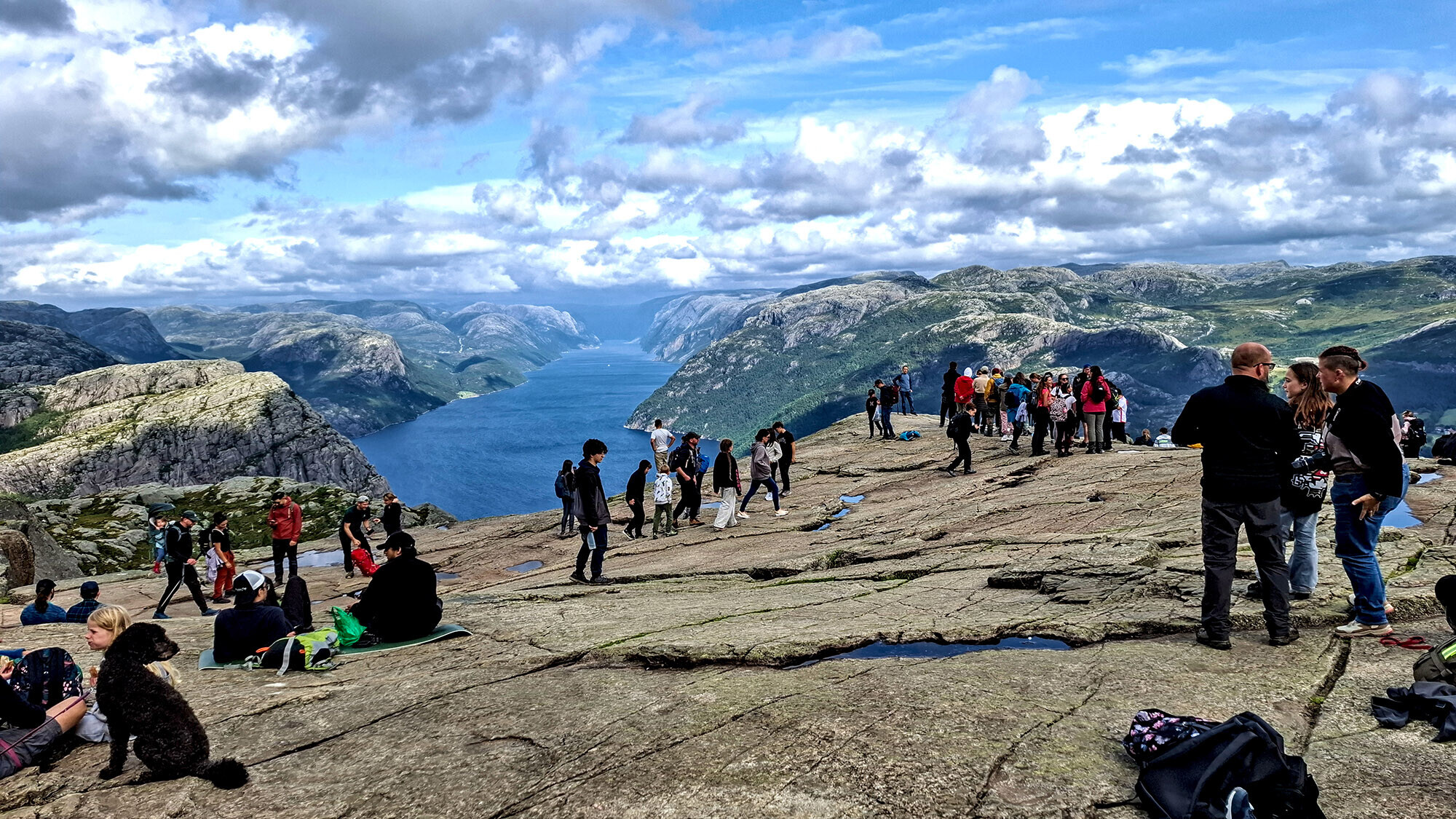 Mens de ventet på å få ta bilder ved klippekanten, snakket de med noen andre svensker som var de første de møtte på hele dagen som de kunne forstå, og så på omgivelsene fra alle tenkelige retninger man kunne komme til. Noe som slo kameratene mens de ventet, var hvor mange helt uforberedte mennesker som befant seg på stedet, og som de også møtte på veien opp. Noen gikk rundt i shorts og t-skjorte og hadde overhodet ingen sekk med seg, noe som kunne ende galt hvis været slo om til det verre, slik det som regel gjør når man er på tur i fjellet.